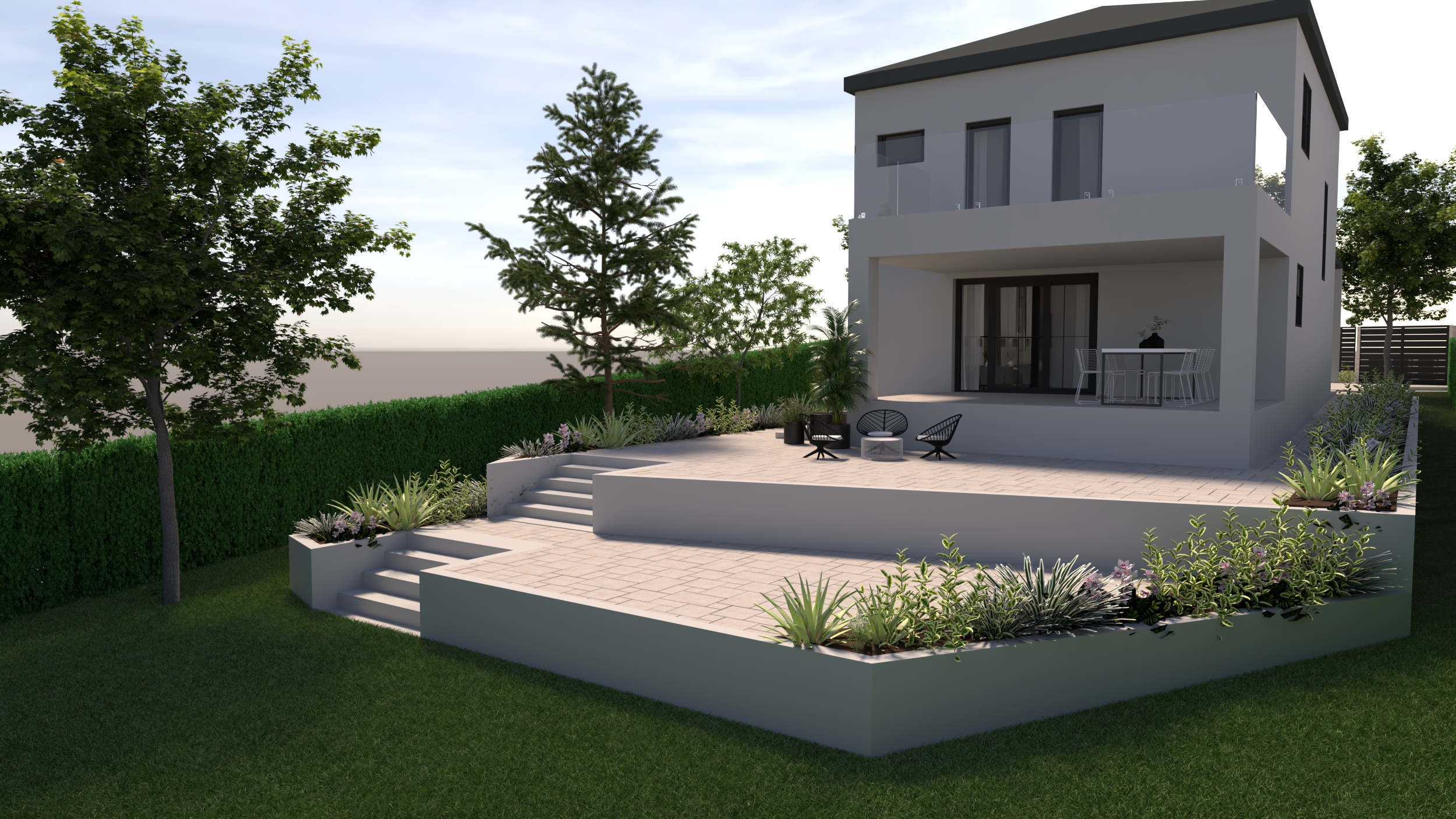 Postizanje ravnoteže terena zbog visinske razlike predstavlja ključnu fazu u oblikovanju vanjskog prostora, jer utječe na cjelokupnu kompoziciju i funkcionalnost okućnice. Visinska razlika između temelja kuće i visine ispod vanjske terase zahtijeva pažljivo oblikovanje, kako bi se stvorio skladan i funkcionalan prostor.